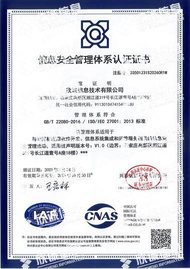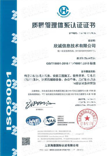 欣誠信息技術有限公司成立于2002年,注冊資金6000萬元,公司總部位于石家莊市高新區長江大道310號天山科技園長江道壹號A座18樓,公司營業面積3000余平方米,現有員工200多人,其中專業研發人員八十余人,中高級職稱占比60%以上。公司主營業務:信息系統建設咨詢、網絡總集成、大數據治理及應用、軟件系統及應用定制與開發、信息安全、運維服務等。為廣大政企客戶提供整體信息化解決方案。